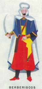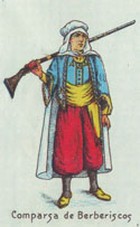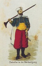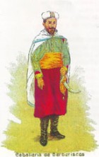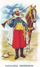 La “Caballería de Berberíscos” presentaba pantalón bombacho rojo, el cual parecía haberse alargado un poquito, por bajo de las rodillas, zapatos negros y polainas, faja amarilla, chaqueta corta y chaleco azul, con trepas, galones y pasamanería en dorado, capa corta bordeada en azul y turbante blanco, con un ornamento en la parte delantera. Contemplaba el diseño un sable en la mano izquierda.